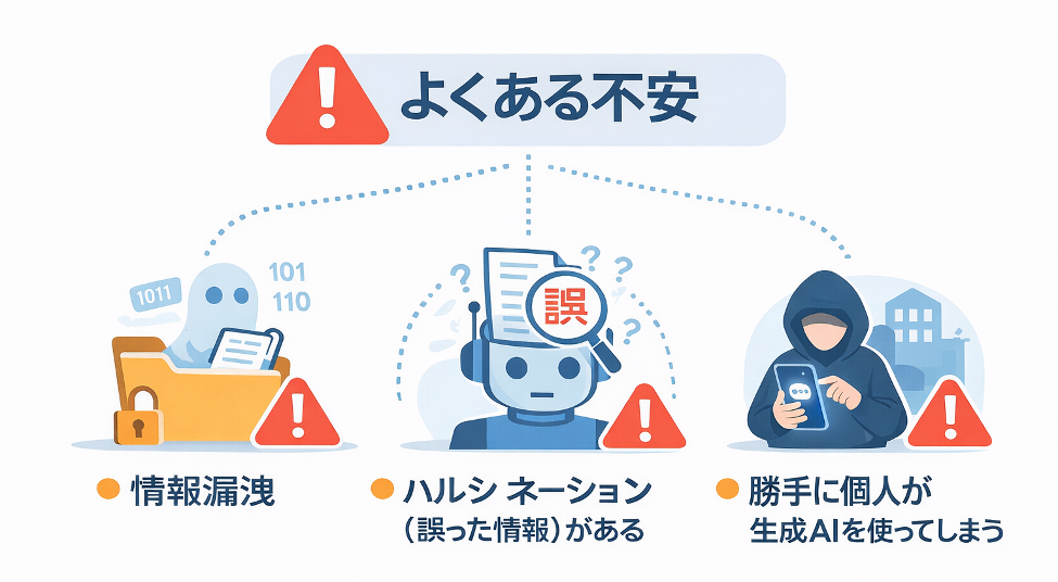生成AIに情報を入力することで、外部に情報が漏れるのではないかという不安です。ただし、これはクラウドサービスを利用する際のリスクと本質的には同じです。